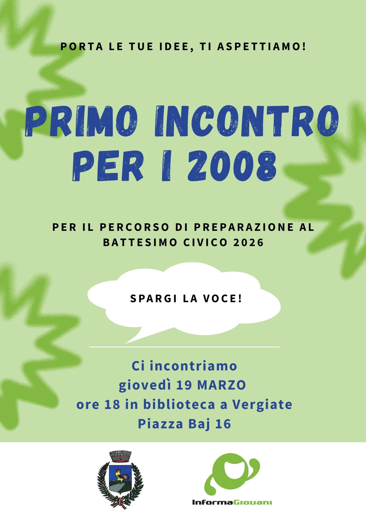 Come di consueto, il servizio InformaGiovani offre a voi ragazze e ragazzi la possibilità di partecipare alla preparazione del battesimo civico, così da darvi spazio e voce: prevediamo alcuni incontri durante i quali le vostre idee e proposte daranno forma alle iniziative da mettere in campo nel corso della giornata del 2 Giugno, alla quale l'intera comunità vergiatese sarà invitata a partecipare!