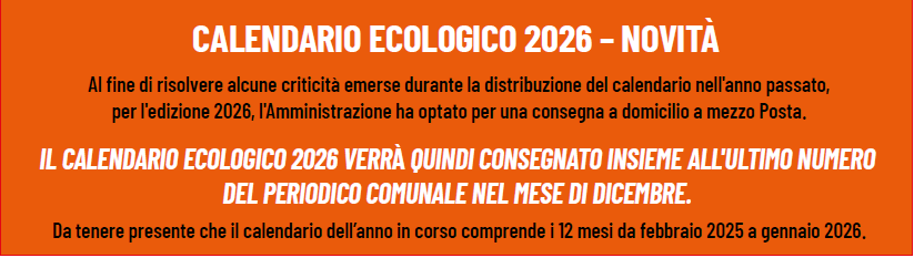 Il CALENDARIO ECOLOGICO comprenderà 12 mesi, da febbraio a gennaio, e verranno riportate tutte le posizioni dei distributori automatici ed i luoghi, con orari, degli ecosportelli di tutti i comuni.